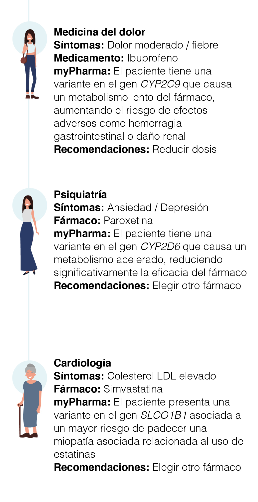 myPharma myPharma Prueba farmacogenómica avanzada basada en guías clínicas ¿Qué es la farmacogenómica? Las enzimas y los receptores que intervienen en el metabolismo y la respuesta a los fármacos están codificados por genes, por lo que su expresión, nivel de actividad y función pueden variar cuando existen variaciones genéticas. myPharma es una prueba genética que identifica variantes específicas mediante la secuenciación del exoma completo (WES) para adaptar la prescripción farmacológica actual y futura del paciente. myPharma incluye un informe completo de 25 genes relacionados con el metabolismo, la eficacia o la toxicidad de 129 principios activos y se realiza a partir de una muestra de sangre o saliva en un kit proporcionado por Veritas. myPharma proporciona información relevante para: Reducir o evitar los efectos adversos de la medicación. Seleccionar la medicación y la dosis más eficaces. Reducir tiempo y recursos para encontrar la medicación más adecuada. Proporcionar una prescripción de medicamentos personalizada de por vida. Áreas médicas de los medicamentos incluidos en myPharma myPharma incluye el análisis de 129 principios activos relacionados con diferentes áreas médicas: myPharma es para todos. El análisis genético se realiza una vez en la vida, y es útil tanto para la prescripción actual de medicamentos como para la futura. Lista de principios activos ¿Está interesado en myPharma pero no tiene un médico prescriptor? Nuestros profesionales médicos pueden ayudarle. Contacto Descargar folleto myPharma en las diferentes etapas de la vida myPharma se ha desarrollado siguiendo directrices farmacogenómicas internacionales. Sólo se incluyen en el informe genes y medicamentos con altos niveles de evidencia. ¿Está interesado en ofrecer myPharma de Veritas? Contacte con nosotros y descubra las formas de colaboración Contacto Descargar folleto médico