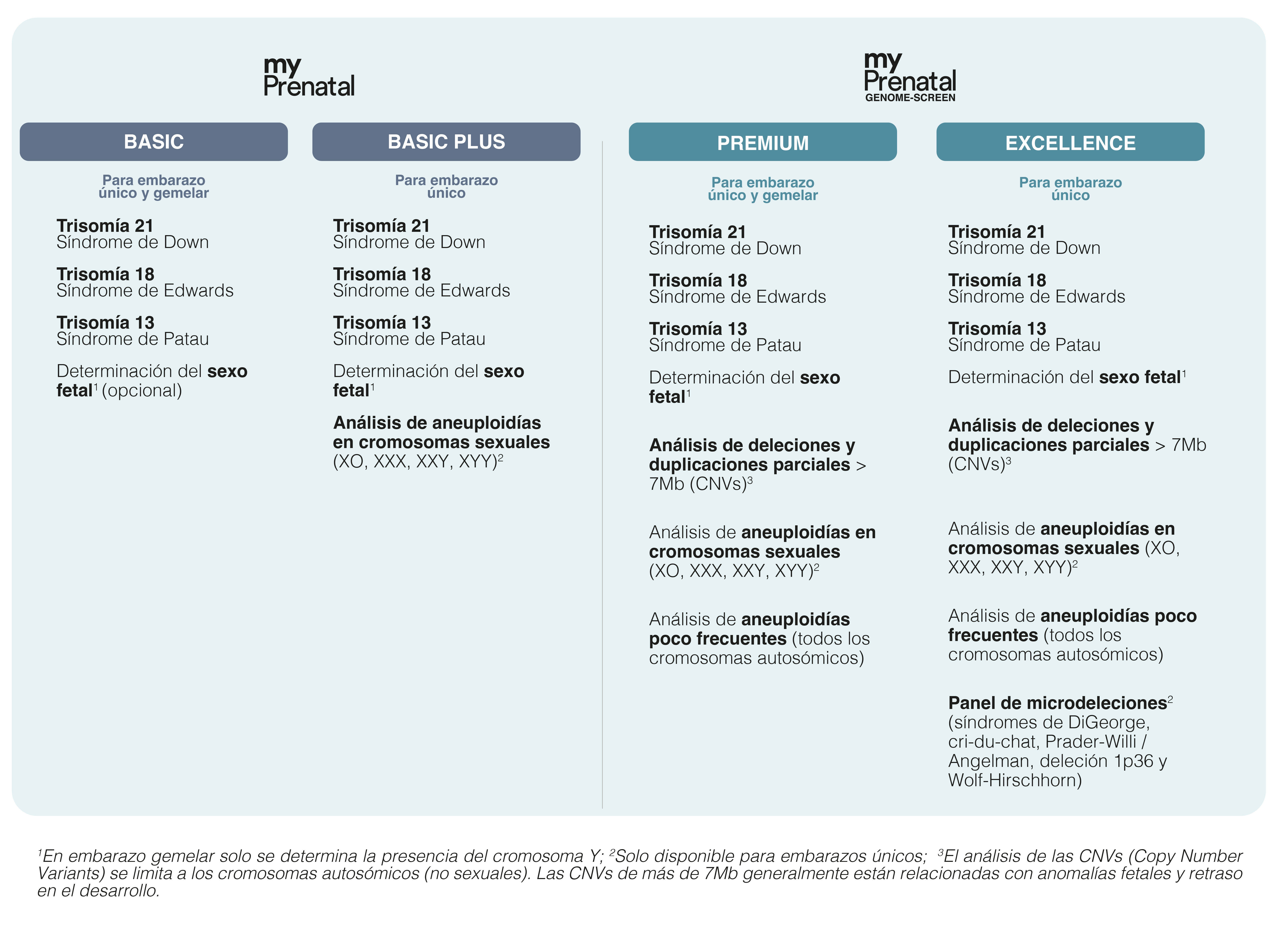 myPrenatal es una prueba avanzada de cribado prenatal que estudia las anomalías cromosómicas más frecuentes como: síndromes de Down, Edwards y Patau (trisomías 21, 18 y 13), junto con otras alteraciones cromosómicas.